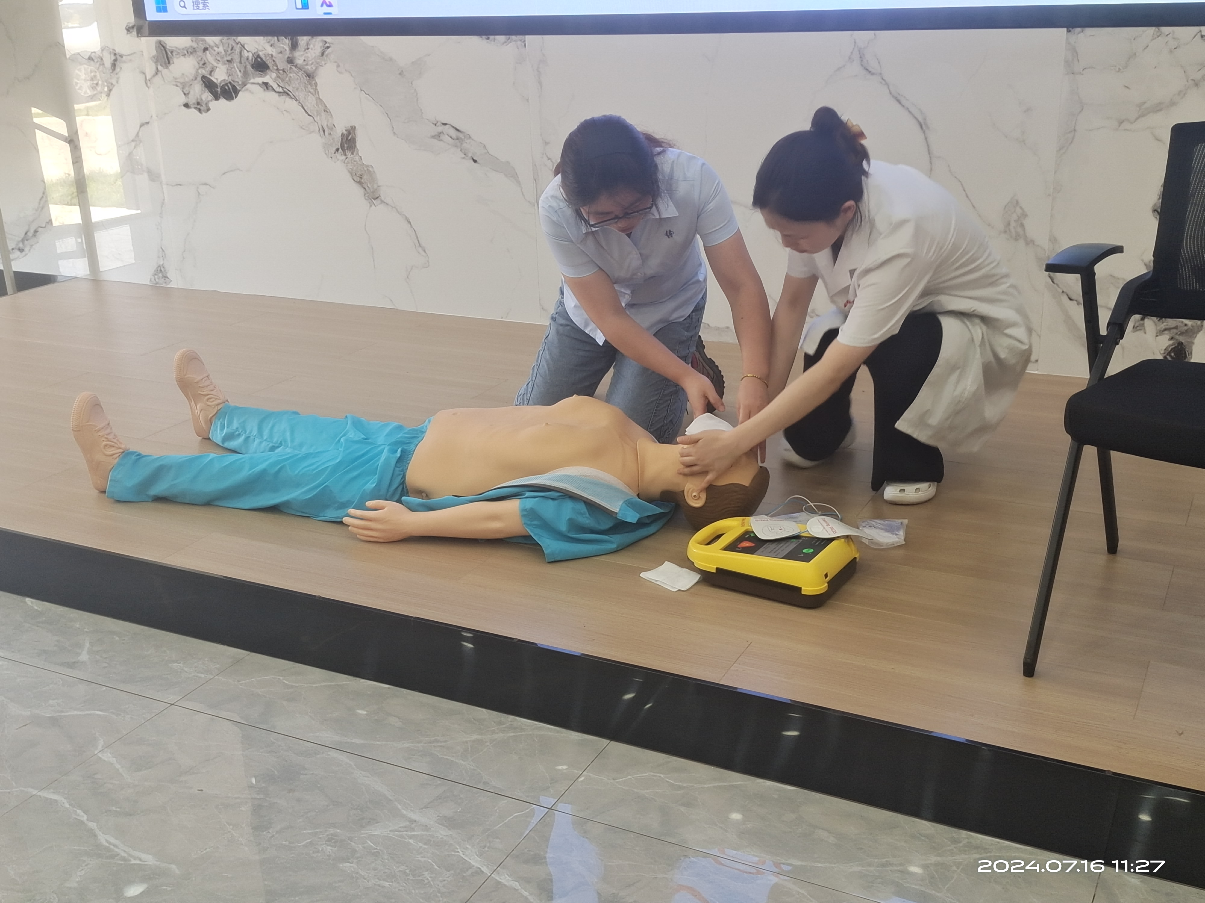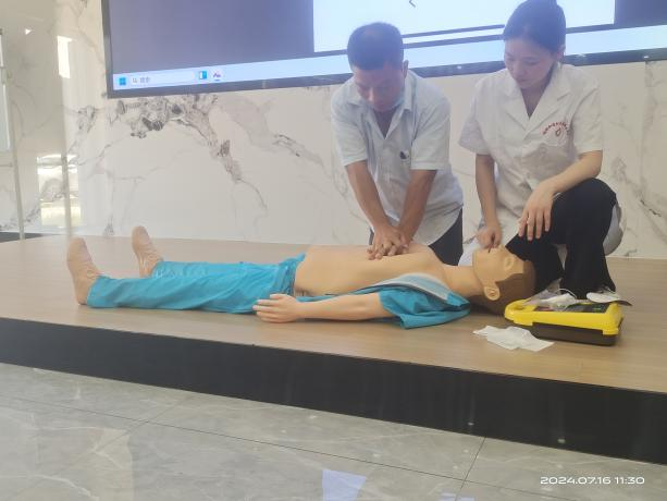 培训分为“心肺复苏及AED的使用”和“了解海姆立克急救法”两个部分。医师使用假人当场示范心肺复苏完整流程,给员工留下了深刻印象。通过情景模拟,向员工们展示了如何运用海姆立克急救法有效应对气道异物梗阻。活动现场,员工们积极参与互动,在医师的指导下有不少员工积极参与上台尝试进行心肺复苏、使用AED,现场气氛活跃。
