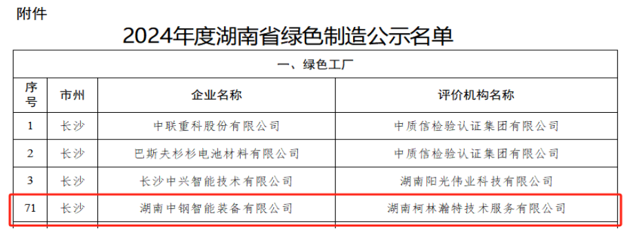10月10日,湖南省工业和信息化厅发布2024年度湖南省绿色制造名单,奇异果官网智能装备有限公司通过层层筛选,专家评审以及现场考察,在众多申报企业中脱颖而出,成功获批湖南省绿色工厂,这标志着中钢装备在推动绿色制造领域上又迈出了坚实的一步。