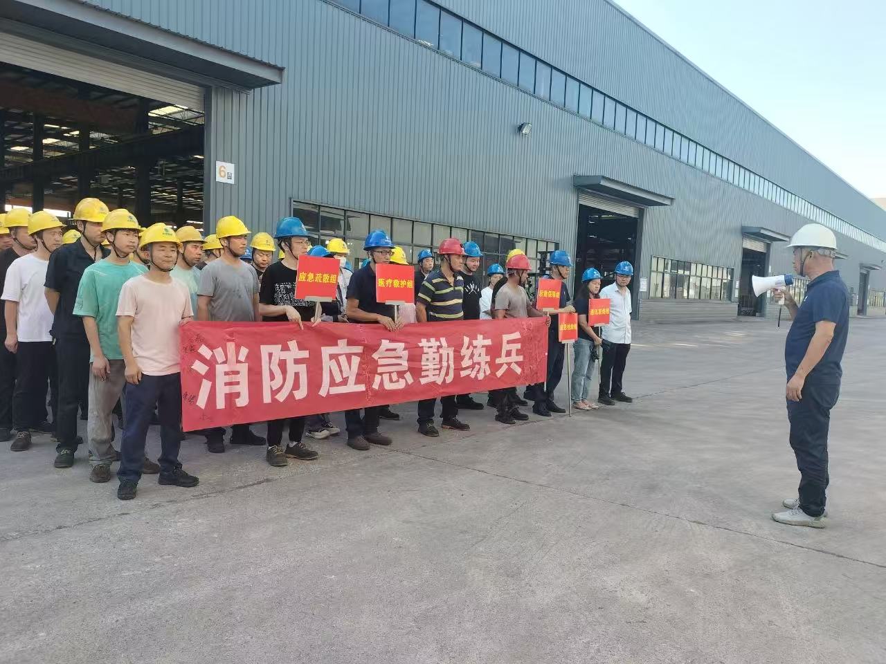 演练聚焦火灾高发风险点,模拟了易燃物堆放物、焊接作业火花引燃及电气故障等场景。流程中,火情发现者第一时间上报,应急指挥部迅速启动预案:通讯联络组(阳丽霞带队)同步传递信息;抢险救援组(曾续辉、李伟强分任组长)穿戴防护装备,运用灭火器、消防水枪精准处置,电气火灾场景中严格执行断电操作;医疗救护组(佘作林牵头)随时待命准备救护;现场保卫组(王伟负责)快速警戒并疏散人员,后勤保障组同步跟进。