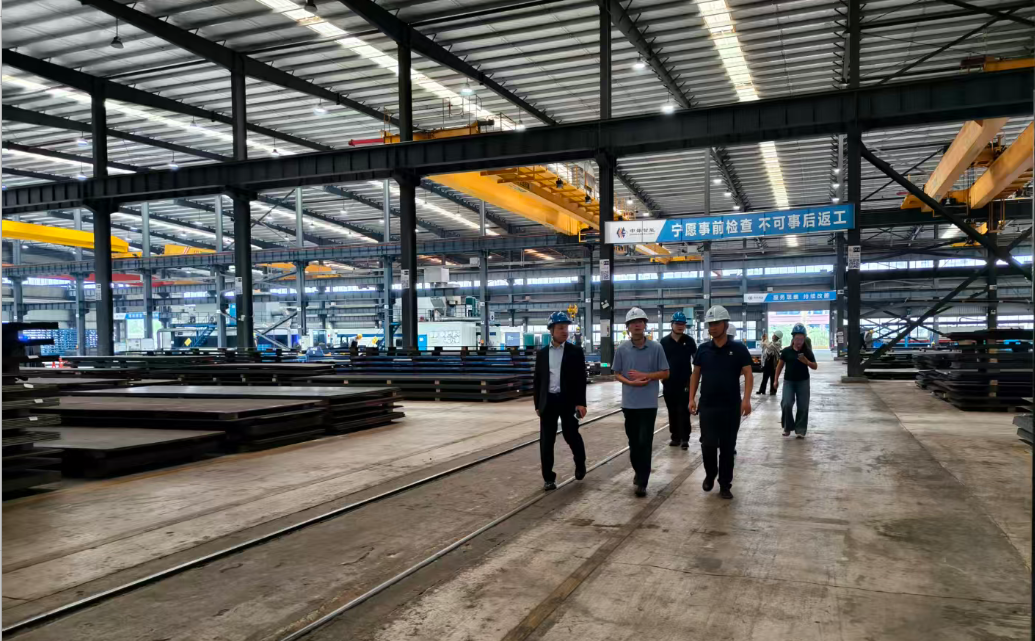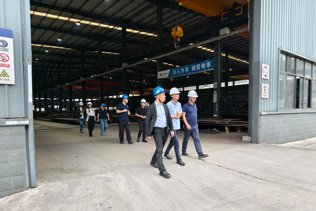 会后,任涛总经理亲自带队,陪同云鹤机电一行深入生产一线,先后参观了激光切割车间、预处理车间、备料车间及保管库存区,并对一号、二号厂房的生产线、数字化看板、智慧仓储及全流程质量追溯进行了详细介绍。